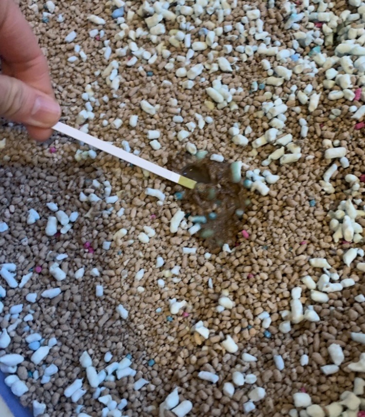 猫ちゃんは採尿中にスティックをお尻の下に差し込まれるのを嫌がる子もいます。慣れると大丈夫になりますが、どうしても嫌がる場合は一時的にシートに変えて、排尿後すぐに浸してください。